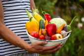 warzywa organiczne. Farmerskie ręce ze świeżo zebranymi warzywami. ukierunkowanie selektywne