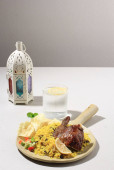 Pyszne kurczaka Biryani na płycie ceramicznej. Briyani Rice Dish Piękne indyjskie danie ryżowe. Pyszne pieczone pikantne kurczaka biryani na placu Plate Over Moody tle, Popularny indyjski, arabski i pakistański.
