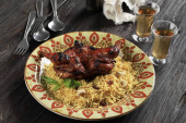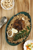 Nasi Briyani lub Biryani Rice with Roast Chicken Noga to typowe jedzenie na Bliskim Wschodzie. Ryż Basmati ugotowany z przyprawami. Podobnie jak Kabli, Kebuli, Mandhi, Kabsah Rice. Zwykle służył w muzułmańskim Eid lub Lebaran Celebration.