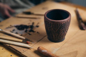 zbliżenie kobieta rzeźbienie gliniany garnek w jej warsztat