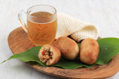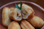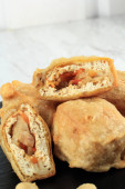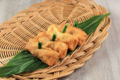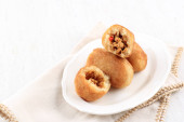 Wybrane Focus Comro lub combro, tradycyjna jawajska przekąska z głęboko smażonej tartej manioku wypełniona pikantną mieszanką oncom lub sfermentowanej soi i chili.