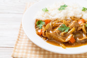 Japoński ryż curry z krojoną wieprzowiną, marchewką i cebulą - styl azjatycki
