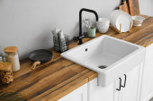 Zdjęcie "Liczniki z ceramicznym zlewem, naczynia kuchenne i jedzenie w pobliżu ściany światła" może być wykorzystywane do celów osobistych i komercyjnych zgodnie z warunkami zakupionej licencji Royalty-free. Obraz jest dostępny do pobrania w jakości wysokiej rozdzielczości do 5760x3840.