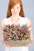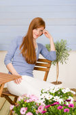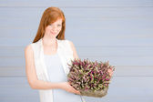 Latem taras ogrodowy Rude kobiety trzymać kwiat