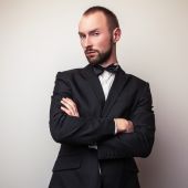 eleganckie idealna pozytywne młody przystojny mężczyzna w stroju. Studio moda piękny portret.