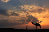 Sylwetki Beduinów chodzenie z jego wielbłąda na zachód, Thar deser