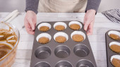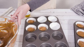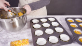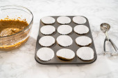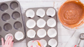 Zbieranie ciasta do folii babeczkowych wkładek do pieczenia czekoladowych babeczek malinowych.