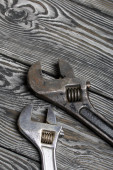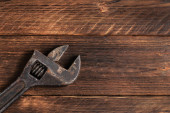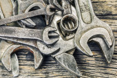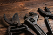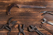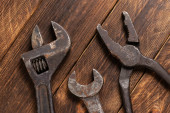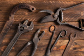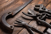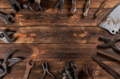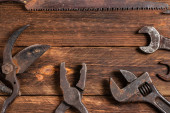 Brudny zestaw narzędzi ręcznych na drewnianych deskach.