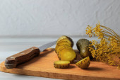 Marynowane ogórki w słoiku z ziołami i przyprawami. Kawałek marynowanego ogórka. Zdrowa fermentowana żywność.