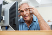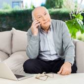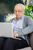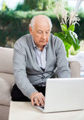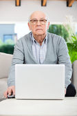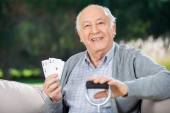 Starszy człowiek za pomocą pilota, siedząc na kanapie