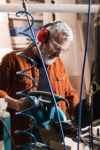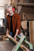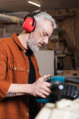 stolarz brodaty pracujący w warsztacie na niewyraźnym pierwszym planie