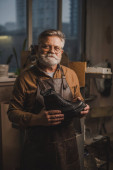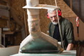 stolarz brodaty w nausznikach trzymający smartfona i patrzący na kamerę w warsztacie