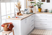 Zdjęcie "Wnętrze jasnonowoczesnej kuchni z zabudową półkową" może być wykorzystywane do celów osobistych i komercyjnych zgodnie z warunkami zakupionej licencji Royalty-free. Obraz jest dostępny do pobrania w jakości wysokiej rozdzielczości do 5760x3840.