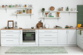 Wnętrze jasnonowoczesnej kuchni z zabudową półkową