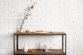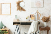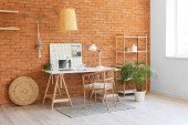Wnętrze nowoczesnego pokoju z miejscem pracy i półkami