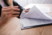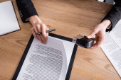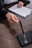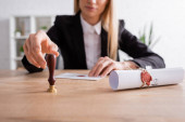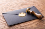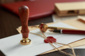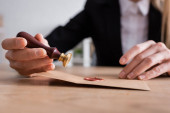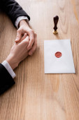 przycięty widok prawnika trzymającego kopertę z pieczęcią woskową w pobliżu niewyraźnej pieczęci