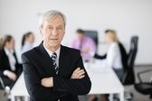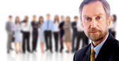 udany biznes człowiek stojący z jego pracowników w tle w urzędzie