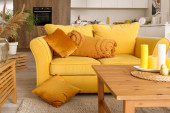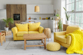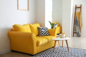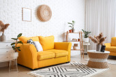 Wnętrze nowoczesnego salonu z żółtą sofą i stołami