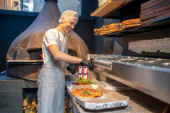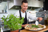 Zdjęcie "Szef kuchni robi polewę na włoskiej pizzy." może być wykorzystywane do celów osobistych i komercyjnych zgodnie z warunkami zakupionej licencji Royalty-free. Obraz jest dostępny do pobrania w jakości wysokiej rozdzielczości do 5760x3840.