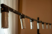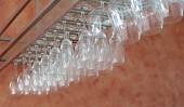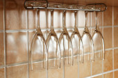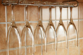 Przezroczyste szklanki do napojów alkoholowych, nakrycia do stołu szklankami, półka szklana, wiszące szklanki na półce.