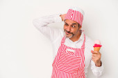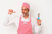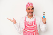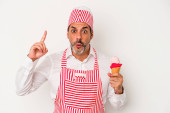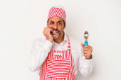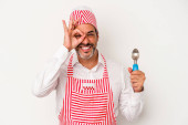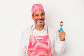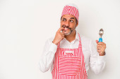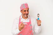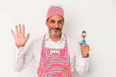 Zdjęcie "Średniowieczny kaukaski lodowiec biały mężczyzna trzyma łyżkę odizolowany na białym tle z palcami na ustach utrzymanie tajemnicy." może być wykorzystywane do celów osobistych i komercyjnych zgodnie z warunkami zakupionej licencji Royalty-free. Obraz jest dostępny do pobrania w jakości wysokiej rozdzielczości do 5760x3840.