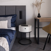 Panorama stylowej sypialni z dużym i wygodnym łóżkiem z widokiem na nowoczesną kabinę prysznicową ze szklaną ścianą