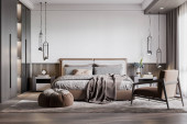 Zdjęcie "Panorama stylowej sypialni z dużym i wygodnym łóżkiem z widokiem na nowoczesną kabinę prysznicową ze szklaną ścianą" może być wykorzystywane do celów osobistych i komercyjnych zgodnie z warunkami zakupionej licencji Royalty-free. Obraz jest dostępny do pobrania w jakości wysokiej rozdzielczości do 5760x3840.