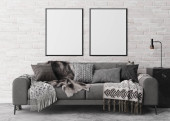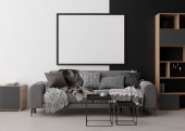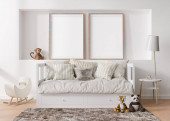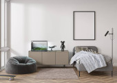 Pusta ramka na białej ścianie w nowoczesnej sypialni. Makijaż wnętrza w nowoczesnym stylu. Darmowe, skopiuj miejsce na swoje zdjęcie, plakat. Łóżko, fotel, konsola, lampa. Renderowanie 3D.