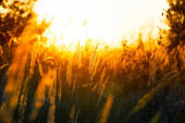 sucha trawa o zachodzie słońca w ciepłym letnim wieczorem