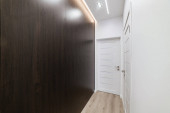nowe jasne wnętrze w mieszkaniu z ciemną ścianą z drewna w pasku