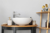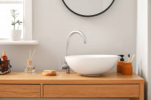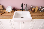 Zdjęcie "Biały zlewozmywak z rośliną domową, naczynia kuchenne i spożywcze na licznikach w pobliżu zielonej ściany" może być wykorzystywane do celów osobistych i komercyjnych zgodnie z warunkami zakupionej licencji Royalty-free. Obraz jest dostępny do pobrania w jakości wysokiej rozdzielczości do 5760x3840.