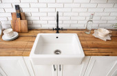 Biały zlewozmywak z rośliną domową, naczynia kuchenne i spożywcze na licznikach w pobliżu zielonej ściany