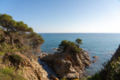 las sosnowy obok dzikiej zatoki na Costa Brava, gdzie zakotwiczona jest łódź rekreacyjna, koncepcja przyrody i styl życia marynarzy