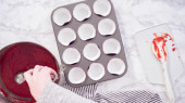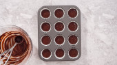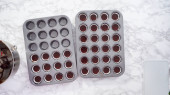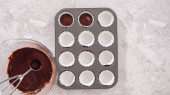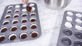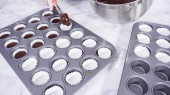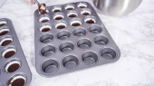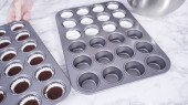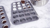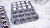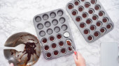 Krok po kroku. Scooping ciasto babeczkowe do linii mini babeczki do pieczenia mini babeczki czekoladowe.