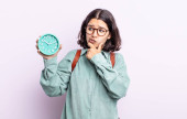 blondynka ładna kobieta uśmiechająca się szczęśliwie i marząca na jawie lub wątpiąca. koncepcja budzika