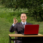 Asian Mężczyzna z laptopem w rękach pokazuje ok