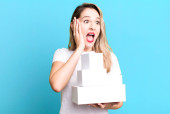 Zdjęcie "ruda głowa ładna kobieta wyglądająca na zaskoczoną, zdając sobie sprawę z nowej myśli, pomysłu lub koncepcji. zabrać koncepcję dostawy" może być wykorzystywane do celów osobistych i komercyjnych zgodnie z warunkami zakupionej licencji Royalty-free. Obraz jest dostępny do pobrania w jakości wysokiej rozdzielczości do 5760x3840.