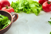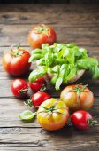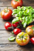 liście bazylii z bliska i zioła, pomidory, składniki do robienia sałatki