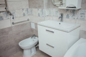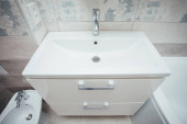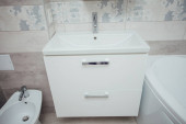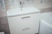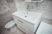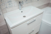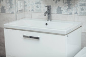 Nowoczesna umywalka z chromowanym kranem i szarym kafelkiem