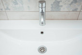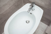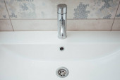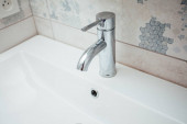 Nowoczesna umywalka z chromowanym kranem i szarym kafelkiem