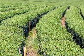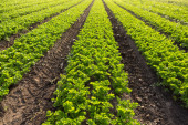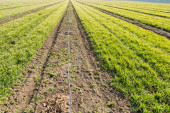 plantacja truskawek pod niskimi szklarniami, rosnąca na zewnątrz, w nasłonecznionym podświetleniu, krajobraz