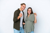 Młoda para kaukaska izolowana na białym tle w ciąży i trzymająca czekoladę