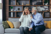 Zdjęcie "Starsza kobieta pomaga mężowi z bólem w klatce piersiowej. Staruszek odczuwa silne bóle. Żona wspierająca męża - para w podeszłym wieku cierpiąca na objawy bólu serca. siedząc w domu w domu" może być wykorzystywane do celów osobistych i komercyjnych zgodnie z warunkami zakupionej licencji Royalty-free. Obraz jest dostępny do pobrania w jakości wysokiej rozdzielczości do 5760x3840.