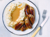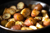 zbliżenie taca z sycylijskiej kiełbasy i ziemniaków pieczone komfort żywności