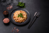 Pilaf z kurczakiem. Tradycyjne orientalne gorące danie z gotowanego ryżu, mięsa z kurczaka, warzyw i przypraw w talerzu