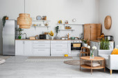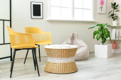 Stylowy stół ze szklanką wody i czasopism w jasnym salonie