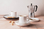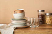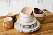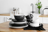 Zestaw czystych zastaw stołowych w kuchni