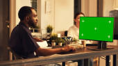 Zdjęcie "Współpracownicy stosujący monitor z makietą na zielonym ekranie" może być wykorzystywane do celów osobistych i komercyjnych zgodnie z warunkami zakupionej licencji Royalty-free. Obraz jest dostępny do pobrania w jakości wysokiej rozdzielczości do 5760x3840.