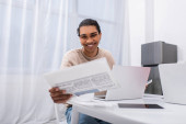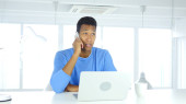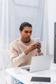 młody afrykański freelancer mówi na smartfonie w pobliżu laptopa, baner