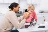 wysoki kąt widok szczęśliwy Afryki amerykański mężczyzna patrząc na blondynkę dziewczyna mówi na smartfonie, baner